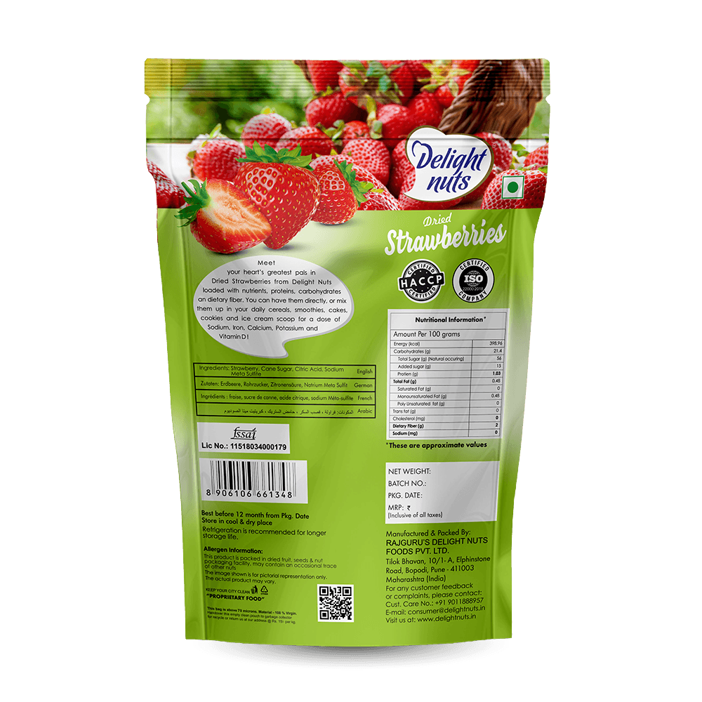 Meet your heart's greatest pals in Dried Strawberries from Delight Nuts. Loaded with healthy antioxidants and dietary fiber. You can have them directly, or mix them up in your daily cereals, smoothies, cakes, muffins and other dishes. Good source of Sodium, Iron, Calcium, Potassium and Vitamin D!