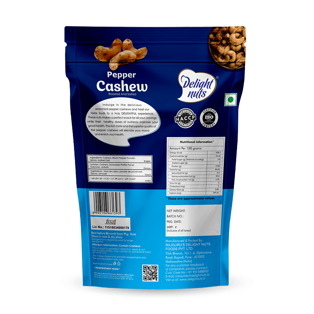 Indulge in the delicious seasoned pepper cashews and treat our taste buds to a truly DELIGHTFUL experience. These are the perfect nuts for all your cravings while their healthy doses of nutrients maintain your good health. The rich taste and the superior quality of these pepper cashews will elevate your mood and enrich your health.