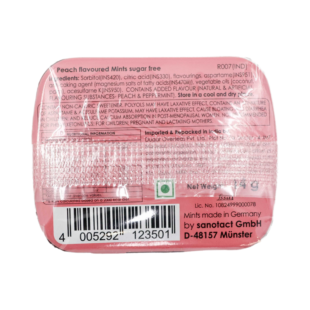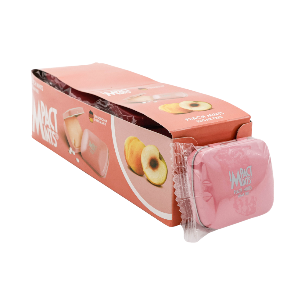Pocket-size sugar-free peach-flavored mints made in Germany. Enjoy the juicy sweetness of ripe peaches with a refreshing minty kick—perfect for freshening breath on the go. Vegan, gluten-free, and no artificial colors.